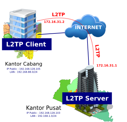 Untuk implementasi kali ini kita akan mencoba melakukan interkoneksi 2 buah network menggunakan L2TP+IPsec. Katakanlah kita mempunyai topologi jaringan 'Kantor Pusat' dan juga 'Kantor Cabang' dimana letaknya saling berjauhan dan koneksi yang paling mudah dan memungkinkan yaitu via WAN (internet).